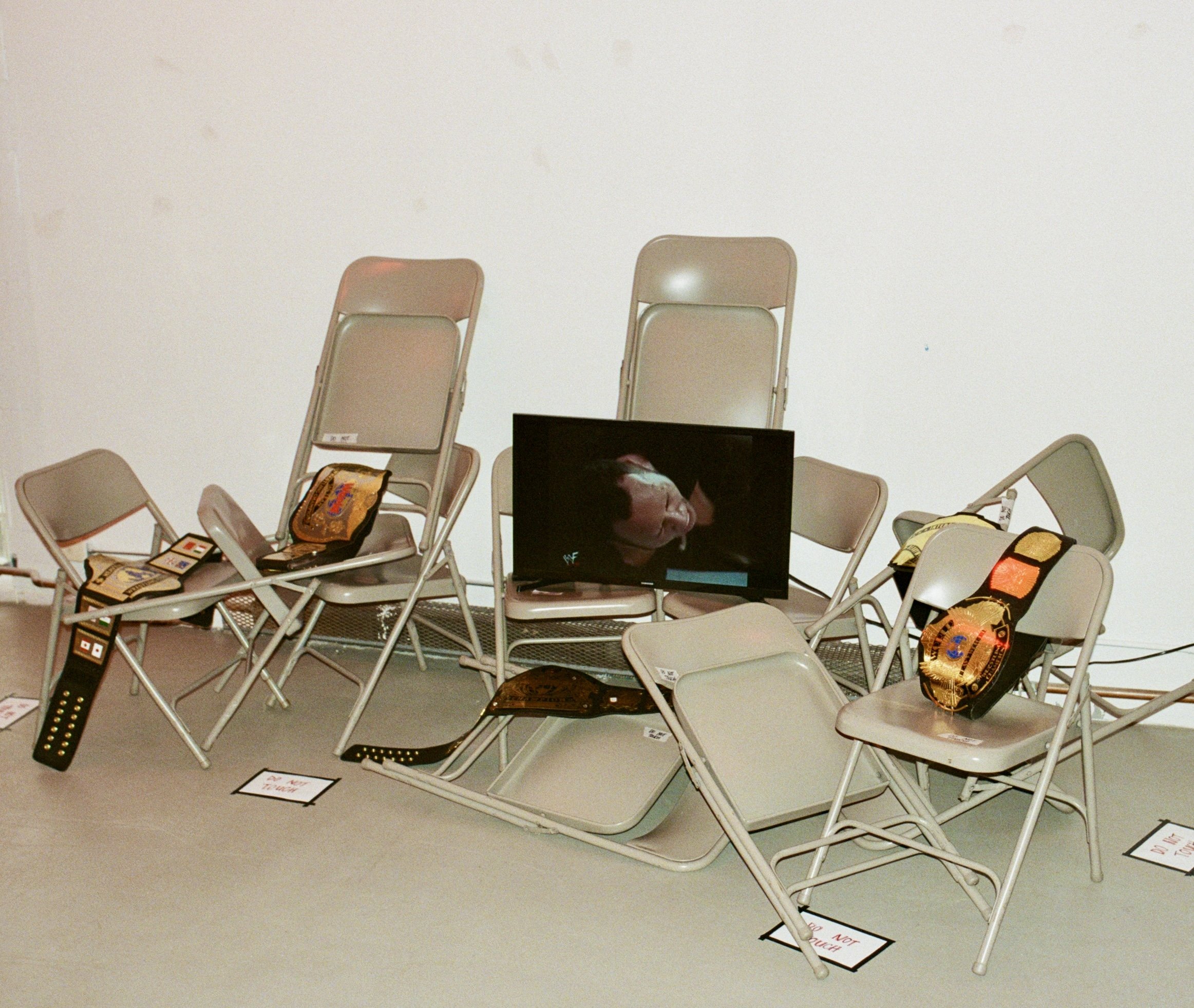Ahkeem Javier Taylor, Leather Face, 2025. Installation. Documented by Ladi Adekiyoa. Space Unltd. ©Kayfabe Foundation, 2024.